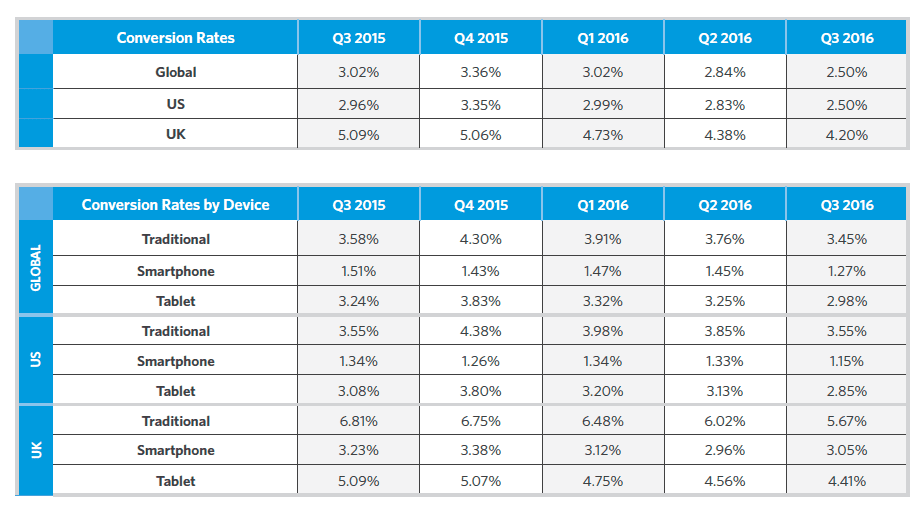 Conversion rates for mobile were around half what they are on desktops in 2016. This data shows that any business who can crack mobile and deliver at least comparable performance to their desktop website, is going to be on the front foot heading into the future.